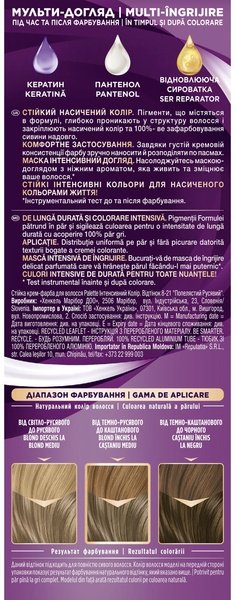 Формула з високоінтенсивними пігментами глибоко проникає в структуру волосся і закріплює пігменти всередині, забезпечуючи інтенсивний блиск, тривалий колір і до 100% забарвлення сивини (залежить від відтінку).