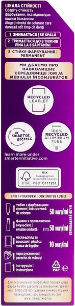 Високоінтенсивні пігменти інноваційної формули глибоко проникають у структуру волосся. До 100% фарбування сивини. Захист від вимивання кольору протягом декількох тижнів.