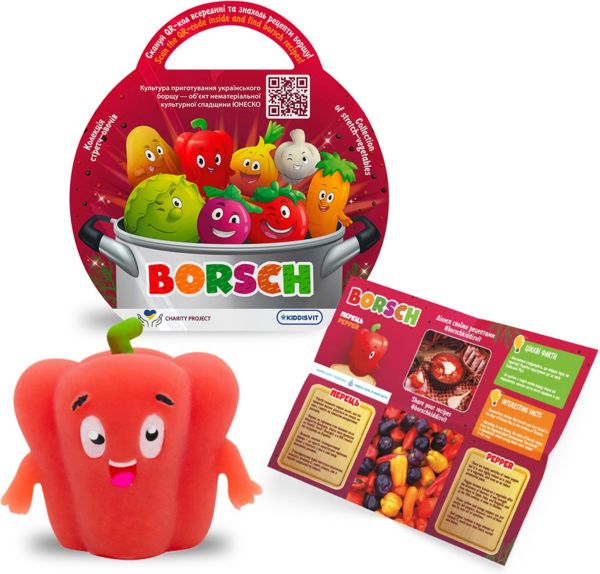 - Освітній елемент: до комплекту входить двомовний (українська та англійська) аркуш колекціонера з цікавими фактами та QR-кодами, що ведуть до рецептів борщу від відомих українських особистостей.