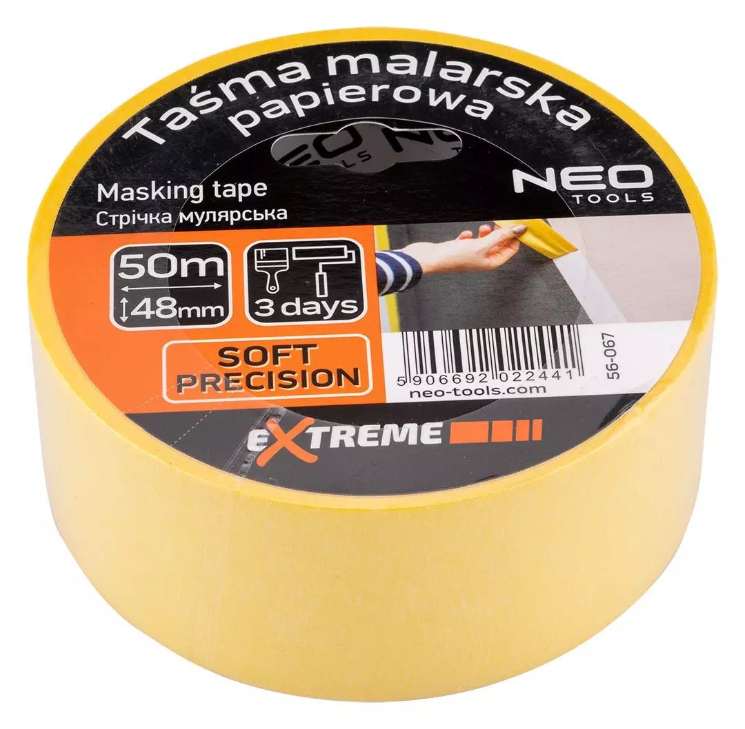 Neo Tools 56-067 забезпечує контроль під час фарбування та захист поверхонь. Формат і властивості стрічки сприяють акуратному виконанню робіт без додаткового очищення.
