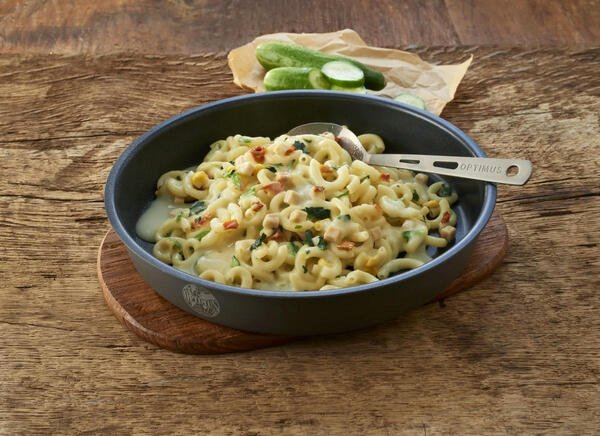 "Паста з куркою та шпинатом у вершковому соусі" - одна з найпопулярніших страв у лінійці німецьких субліматів Trek'n Eat. Для приготування залийте гарячу воду в пакет, перемішайте і почекайте 15 хвилин. Швейцарські сублімати Trek'n Eat - це натуральна їжа, яку дуже легко готувати. Просто залийте окріп у пакет, розмішайте і почекайте 10 хвилин, поки вода вбереться.