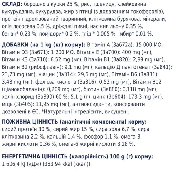 | Склад | Борошно з курки 25%, рис, пшениця, клейковина кукурудзяна, кукурудза, жир з птиці (з додаванням токоферолів), протеїн гідролізований тваринний, бурякова, мінерали, олія лососева 0,5%, дріжджі пивні, насіння льону 0,35 банан 0,23%, помідори 0,2%, глід 0,065%, імбир 0,01% |