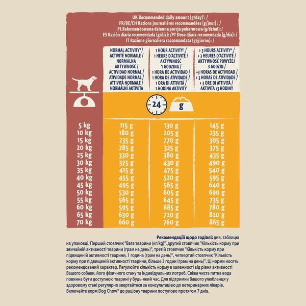 Рекомендації щодо годівлі: див. таблицю на упаковці. Перший стовпчик "Вага тварини (кг/kg)", другий стовпчик "Кількість корму при звичайній активності тварини (грам на день)", третій стовпчик "Кількість корму при підвищеній активності тварини, 1 година (грам на день)", четвертий стовпчик "Кількість корму при підвищеній активності тварини, більше 3 годин (грам на день)". Ці норми носять рекомендований характер. Регулюйте кількість корму в залежності від рівня активності Вашого собаки, його фізичного стану та індивідуальних потреб. Свіжа чиста питна вода повинна бути доступною тварині у будь-який час. Для підтримки Вашого улюбленця у здоровому стані регулярно звертайтеся за консультацією до ветеринарних лікарів.