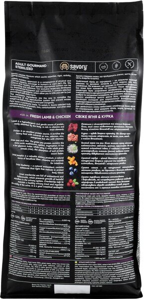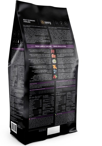 Холістична рецептура зі свіжим ягням та куркою для кастрованих та стерилізованих котів і кішок, малоактивних, брахіцефалів та тих хто має надмірну вагу чи схильність до неї. Має меншу калорійність на відміну від іншої позиції сухого корму Savory для стерилізованих.