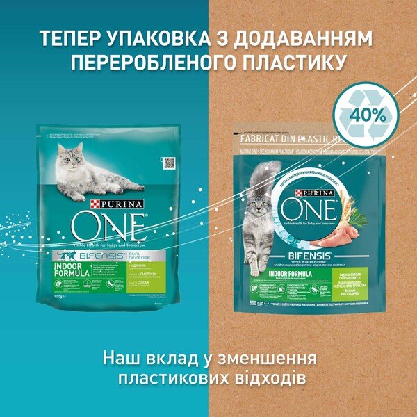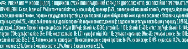 Purina one Indoor (Пуріна ВАН Індор). З індичкою та цільними злаками. Сухий повнораціонний корм для дорослих котів, які постійно перебувають у приміщенні. Коти, що переважно живуть вдома, приділяють багато часу вилизуванню шерсті – це дає їм змогу розслаблятися й підтримувати чистоту. На жаль, така звичка часто призводить до формування кульок шерсті, що можуть спричинити дискомфорт. Ці коти також мають схильність більше лежати та спати, а тому вони менш фізично активні. Як наслідок, їхні потреби в енергії можуть зменшуватися, тож домашні коти є більш схильними до набирання ваги. Формулу корму Purina one Indoor спеціально створено для кішок, які переважно живуть вдома. Його можна застосовувати для мінімізації утворення кульок шерсті. Він полегшує виведення ковтунів із травного тракту. Цикорій у його складі – це високоякісний натуральний інгредієнт, який зменшує запах із туалету, сприяє розмноженню «доброї» мікрофлори кишечника й підтримує здоров'я травної системи. Завдяки правильній пропорції білків і жирів, а також інструкції з годування, цей корм допомагає підтримувати здоровий стан організму.