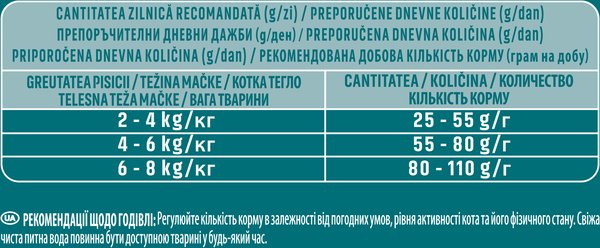 | Харчові добавки | Вітамін А: 36500; вітамін D3: 1200; вітамін Е: 460; мг/кг (mg/kg): вітамін С: 140; таурин: 780; сульфат заліза: (Fe: 80); йодат кальцію: (I: 2.0); сульфат міді: (Cu: 12; сульфат марганцю: (Mn: 35); сульфат цинку: (Zn: 120); селеніт натрію: (Se: 0.11). |