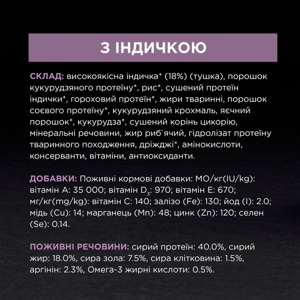 | Склад | Високоякісна індичка (18%) (тушка), порошок кукурудзяного протеїну, рис, сушений протеїн індички, гороховий протеїн, жири тварини, порошок соєвого протеїну, кукурудзяний крохмаль, яєчний порошок, кукурудза, сушений корінь цикорію, мінеральні речовини, жир риб, гідролізат протеїнів тваринного походження, дріжджі |