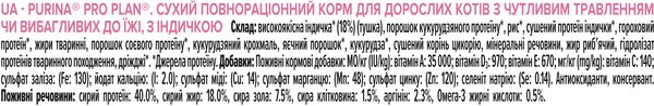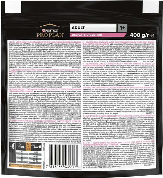 Purina PRO PLAN Adult 1+ Delicate Digestion для дорослих кішок із чутливою травною системою або вибагливих до їжі — високоякісний корм, який містить усі необхідні поживні речовини, включно з вітамінами та мінеральними речовинами.