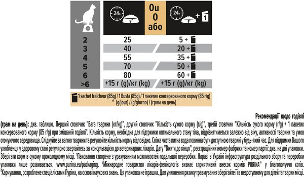 Перший стовпчик "Вага тварини (кг/kg)", другий стовпчик "Кількість сухого корму (г/g)", третій стовпчик "Кількість сухого корму (г/g) + 1 пакетик консервованого корму (85 г/g) при змішаній годівлі". Кількісь корму, необхідна для підтримки оптимального стану тіла, відрізнятиметься залежно від віку, активності тварини та умов оточуючого середовища. Слідкуйте за вагою тварини та регулюйте кількість корму відповідно. Свіжа чиста питна вода повинна бути доступною тварині у будь-який час. Для підтримки Вашого улюбленця у здоровому стані регулярно звертайтесь за консультацією до ветеринарних лікарів.