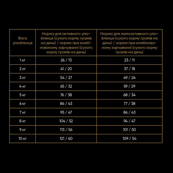 | Харчові добавки | Вітамін A 20.000 МО, вітамін D3 1.750 МО, вітамін E 450 мг, L-карнітин 100 мг, кальцій (Ca) 1.2%, фосфор (P) 0.8%, таурин 1.500 мг, залізо 70.0 мг, 10.0 мг, 0,0 мг. магній 40.0 мг, йод 1.5 мг, селен 0.2 мг |