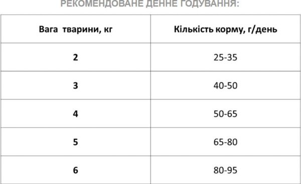 | Аналітичні компоненти | Сирий протеїн – 32%, сирий жир – 14%, сира зола – 6,7%, сира клітковина – 2,5%, кальцій – 1,1%, фосфор – 0,9%, омега-3, омега-6 |