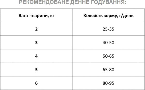 | Харчові добавки | Вітамін А – 10560 МО, вітамін Д3 – 1055 МО, вітамін Е – 384 мг, вітамін В1 – 4,8 мг, аскорбінова кислота – 250 мг, вітамін В2 – 6,4 мг, вітамін В5 – 5,5 мг, вітамін РР – 32,7 мг, вітамін В4 – 4,1 мг, фолієва кислота – 0,87 мг, вітамін В12 – 0,146 мг, біотин – 0,064 мг, цинк сульфат – 352 мг, сульфат заліза – 81 мг, міді сульфат – 33,84 мг, сульфат марганцю – 77,4 мг, таурин – 2000 мг, холін хлорид 60 % – 3,5 г |