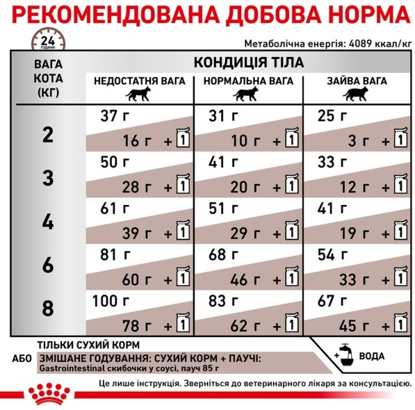 Підвищений вміст енергії відповідає енергетичним потребам кота, дає змогу обмежити об'єм порції корму та знизити навантаження на шлунково-кишковий тракт. Це також сприяє одужанню та відновленню.