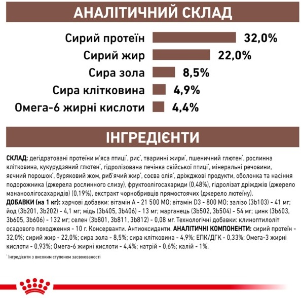 | Склад | Дегідратовані протеїни м'яса птиці, рис, тваринні жири, пшеничний глютен, рослинна клітковина, кукурудзяний глютен, гідролізована печінка свійської птиці, мінеральні речовини, яєчний порошок, буряковий жом, риб'ячий жир, соєва олія, дріжджові продукти, оболонка слизу), фруктоолігосахариди (0,48%), гідролізат дріжджів (джерело маннанолігосахаридів) (0,19%), екстракт чорнобривців прямостоячих (джерело лютеїну). |