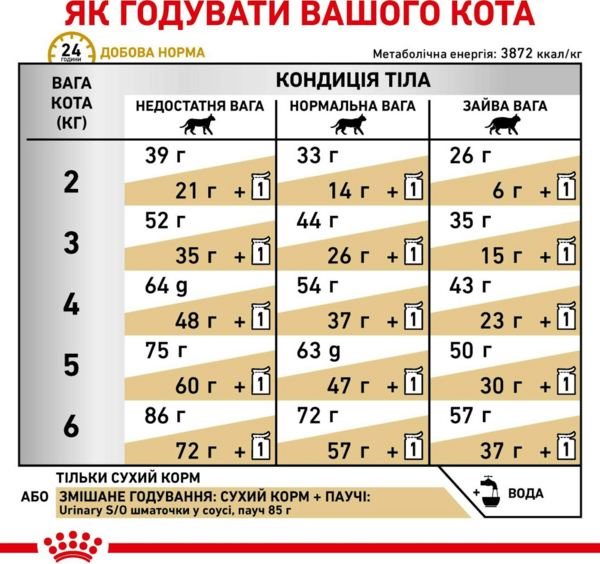 Перед початком споживання слід проконсультуватися з ветеринарним лікарем. Годування кормом Urinary S/O від 5 до 12 тижнів для розчинення струвітних каменів. Для попередження рецидивів уролітіазу курс лікування слід продовжувати ще не менше 6 місяців, при цьому необхідно регулярне проведення аналізів сечі.