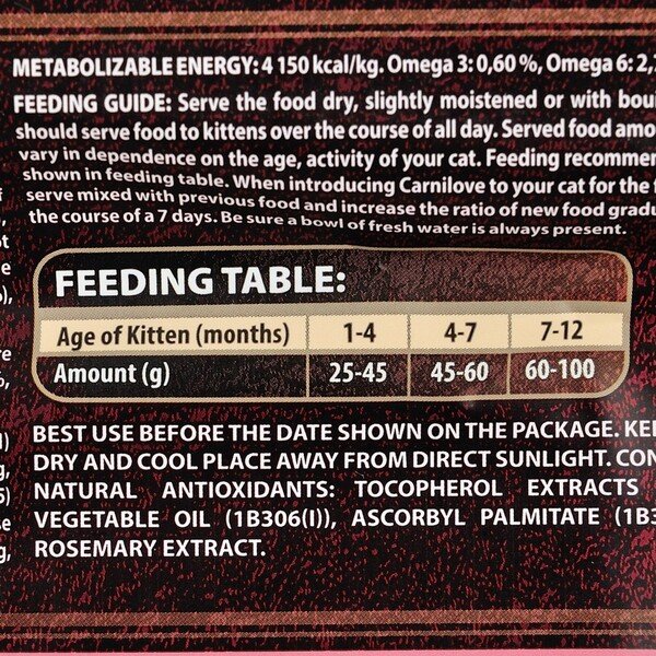 Рекомендації щодо годування: давати корм сухим або змочивши у теплій воді або бульйоні. Годувати необхідно тричі на день. Кількість корму можна змінити залежно від віку та активності вашого вихованця. Коли годуєте кормом Carnilove вперше, змішуйте невелику кількість із попереднім кормом, і збільшуйте співвідношення поступово упродовж тижня. Завжди перевіряйте наявність свіжої води.