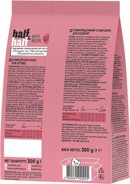 Повноцінний сухий корм для кошенят усіх порід до 1 року. Забезпечує улюбленця необхідними поживними речовинами для здорового та повноцінного росту та розвитку на усіх етапах формування. Збагачена фруктами, овочами, хондропротекторами й лікарськими рослинами рецептура Half&Half піклується про оптимальну користь та смак у кожній порції.