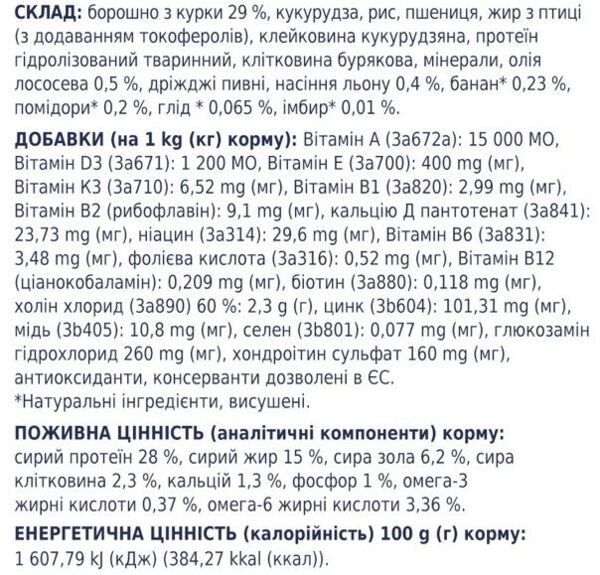 | Склад | Борошно з курки 29%, кукурудза, рис, пшениця, жир із птиці (з додаванням токоферолів), клейковина кукурудзяна, протеїн гідролізований тваринний, клітковина бурякова, мінерали, олія лососева 0,5%, дріжджі пивні, насіння льна , банан 0,23%, помідори 0,2%, глід 0,065%, імбир 0,01% |