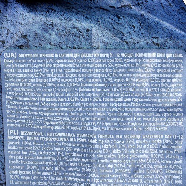 | Склад | Борошно з лосося (25%), борошно з індички (20%), горох жовтий (19%), курячий жир (консервований токоферолами, джерелом вітаміну Е, 10%), гідролізований лосось (5%), гідролізований курячий протеїн (5%), крохмаль з тапіоки (5%), куряча печінка (3%), яблука (2%), риб`ячий жир лососевий (2%), морква (1%), лляне насіння (1%), нут (1%), гідролізовані панцирі ракоподібних (джерело глюкозаміну, 0,031%), Екстракт хряща (джерело хондроїтину, 0,019%), пивні дріжджі (джерело маннан-олігосахаридів) 0,018%, корінь цикорію (джерело фрукто-олігосахаридів, 0,012%), юкка шидигера (0,0 0,01%), чебрець (0,01%), розмарин (0,01%), орегано (0,01%), журавлина (0,0008%), лохина (0,0008%), малина (0, 0008%) |