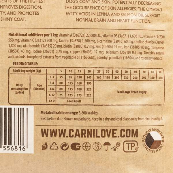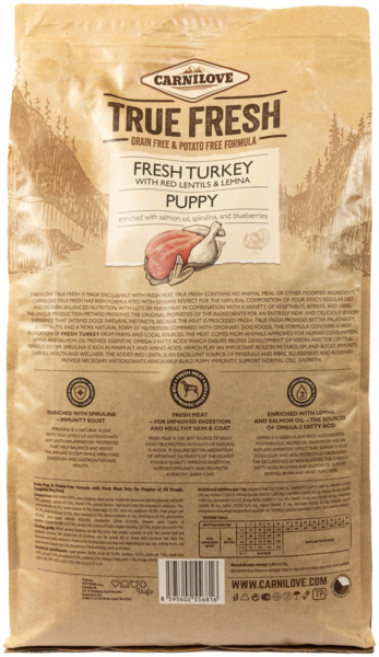 Корм класу холістик Carnilove True Fresh Turkey Puppy для цуценят збагачений олією лосося, спіруліною та чорницею. Рецептура корму містить високий відсоток свіжого індичого м'яса з ферм і місцевих джерел. Ряска і лососева олія є джерелом незамінних омега-3 жирних кислот, які забезпечують правильний розвиток зору і центральної нервової системи. Спіруліна багата на мінерали й амінокислоти, які відіграють важливу роль у метаболізмі та зміцнюють імунітет, загальне здоров'я і гарне самопочуття. Додана червона сочевиця є чудовим джерелом мінеральних речовин і клітковини. Чорниця і розмарин забезпечують необхідні антиоксиданти, які допомагають зміцнити імунітет цуценяти та підтримують нормальний ріст клітин.