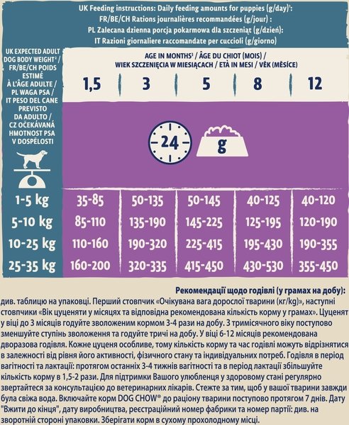 Рекомендації щодо годівлі (у грамах на добу): див. таблицю на упаковці. Перший стовпчик «Очікувана вага дорослої тварини (кг/kg)», наступні стовпчики «Вік цуценяти у місяцях та відповідна рекомендована кількість корму у грамах». При досягненні собакою 12-ти місячного віку рекомендовано перейти на харчування для дорослих собак. Цуценят у віці до 3 місяців годуйте зволоженим кормом 3 - 4 рази на добу. З тримісячного віку поступово зменшуйте ступінь зволоження та годуйте тричі на добу. У віці 6 - 12 місяців рекомендована дворазова годівля. Кожне цуценя особливе, тому кількість корму та час годівлі можуть відрізнятися в залежності від рівня його активності, фізичного стану та індивідуальних потреб. Годівля в період вагітності та лактації: протягом останніх 3 - 4 тижнів вагітності та в період лактації збільшуйте кількість корму в 1.5 - 2 рази. Для підтримки Вашого улюбленця у здоровому стані регулярно звертайтеся за консультацією до ветеринарних лікарів. Стежте за тим, щоб у вашої тварини завжди була свіжа вода. Включайте корм Dog Chow до раціону тварини поступово протягом 7 днів.