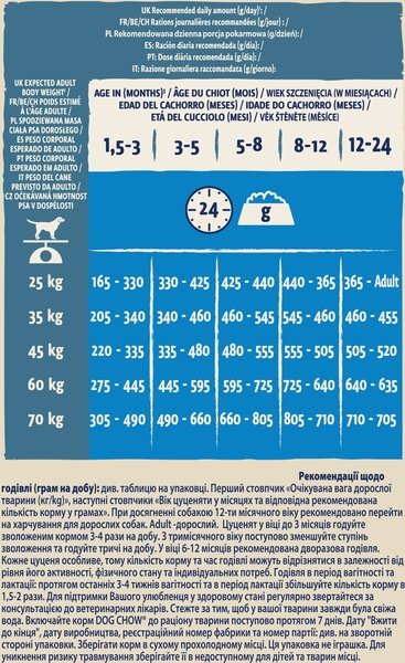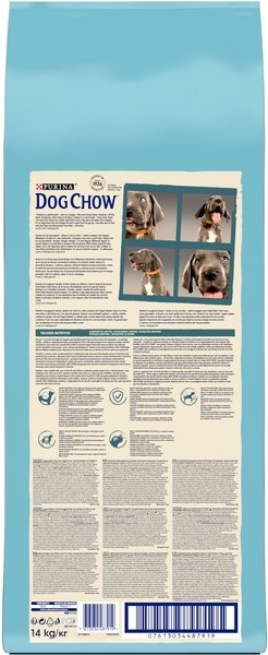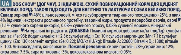 Сухий повнораціонний корм для цуценят великих порід. Також підходить для вагітних та лактаційних собак великих порід. Як і ви, ми розуміємо, що собаки живуть більш щасливим та здоровим життям, коли вони можуть поводитися природно, жити на повну, досліджуючи навколишній світ! Ось чому Purina, з нашим досвідом роботи в галузі харчування та дослідження поведінки собак, ще з 1926 року створили корм Dog Chow: харчування, розроблене з урахуванням потреб собак. Зростання є складною роботою для вашого цуценяти. Тому до складу сухого повнораціонного корму Dog Chow для цуценят входять антиоксиданти та докозагексаєнова кислота для підтримки природного захисту і здорового росту Вашого цуценяти. Корм також містить відібрані натуральні інгредієнти та цикорій, який має пребіотичні властивості для підтримки здорового травлення, щоб Ви були впевнені у тому, що Ваше цуценя готове день за днем досліджувати навколишній світ.