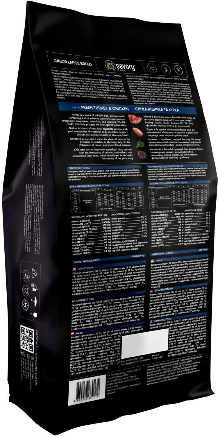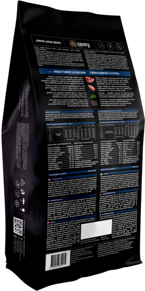 Ексклюзивна рецептура корму була розроблена досвідченими європейськими фахівцями з харчування хатніх улюбленців. Використовуючи холістичний підхід, вдалося створити біологічно відповідний, здоровий раціон для собак, який є таким корисним і смачним, що лапки оближеш. Поєднання добірних натуральних інгредієнтів дає змогу піклуватися про здоров'я чотириногого, а вишуканий смак — дарувати йому насолоду від щоденного споживання корму Savory. Сухий корм для цуценят великих порід Savory містить якісне м'ясо індички та курки, суперфуди, яблука, шпинат і куркуму. Ці компоненти створені природою для оптимального росту, захисту суглобів і розвиненої мускулатури юних велетнів.