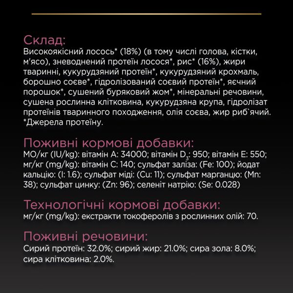 Лосось (18%), зневоднений протеїн лосося, рис (16%), жир тваринний, кукурудзяна клейковина, кукурудзяний крохмаль, борошно соєве, зневоднений соєвий протеїн, яєчний порошок, сушений буряковий жом, мінеральні речовини, клітковина, кукурудзяна крупа, гідролізат протеїнів тваринного походження, олія соєва, жир риб′ячий.