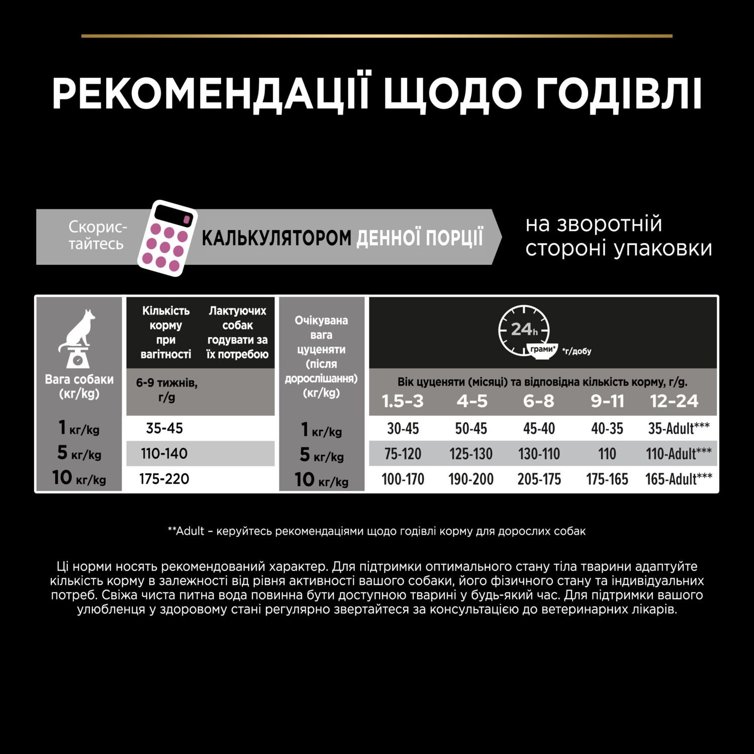 Рекомендації щодо годівлі (грам на добу) кормом для цуценят: див. таблицю на упаковці. 1й стовпчик "Очікувана вага цуценяти (після дорослішання), кг/kg", наступні стовпчики "Вік цуценяти (місяці) та відповідна кількість корму, г/g". Adult - керуйтесь рекомендаціями щодо годівлі корму для дорослих собак.