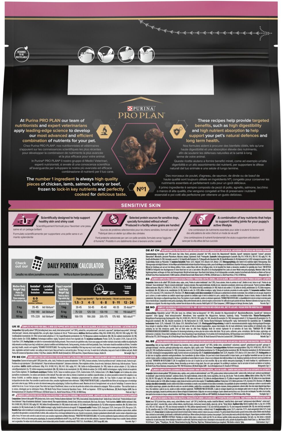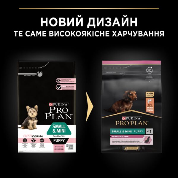 Сухий повнораціонний корм для цуценят малих порід з чутливою шкірою. Також підходить для вагітних та лактуючих собак. З лососем. Корм сухий повнораційний для цуценят дрібних та карликових порід із чутливою шкірою, з високим вмістом лосося. Також може бути рекомендований для годування вагітних та годуючих собак. Деякі цуценята мають схильність до розчісування та роздрапування своєї шкіри, у них може частіше спостерігатися лупа. Розроблений ветеринарами та дієтологами корм Purina Pro Plan із комплексом Optiderma (Оптидерма) забезпечує покращене харчування, яке підтримує чутливу шкіру цуценят.