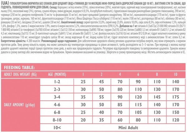 Гіпоалергенна формула з ягнятиною, без злаків для цуценят (від 2 тижнів до 10 місяців) мініпорід (до 10 кг), вагітних сук та собак, що годують. Повноцінний корм суперпреміум класу.