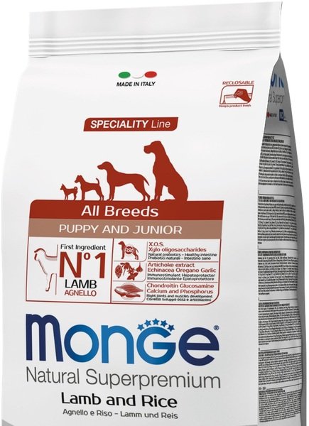 MONGE SPECIALITY LINE PUPPY JUNIOR ALL BREEDS LAMB, RICE AND POTATOES - це повнораціонний збалансований раціон для цуценят усіх порід.