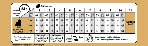 Дуже довга, м'яка й шовковиста шерсть йоркширського тер'єра росте постійно. Відсутність підшерстку спричинює чутливість шкіри собаки до перепадів температури. Йоркширський тер'єр відзначається вибагливим смаком, тому для задоволення його харчових потреб необхідний раціон із підвищеною смаковою привабливістю. Ексклюзивна формула раціону допомагає підтримувати здоров'я довгої шерсті йоркширського тер'єра. Корм збагачений жирними кислотами омега-3 та омега-6, олією огірочника та біотином. Завдяки комбінації особливих ароматів формула допомагає задовольнити апетит собак, вибагливих до корму.