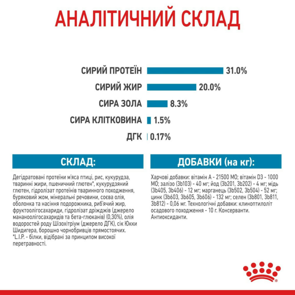 | Склад | Дегідратовані протеїни м'яса птиці, рис, пшеничний глютен, тваринні жири, кукурудза, гідролізат протеїнів тваринного походження, дріжджові продукти, буряковий жом, рослинна клітковина, соєва олія, мінеральні речовини, риб'ячий жир, фруктоолігосахариди, гідролізат новий ) (0,30%), олія водоростей роду шизохітріум (джерело ДГК), борошно чорнобривців прямостоячих |