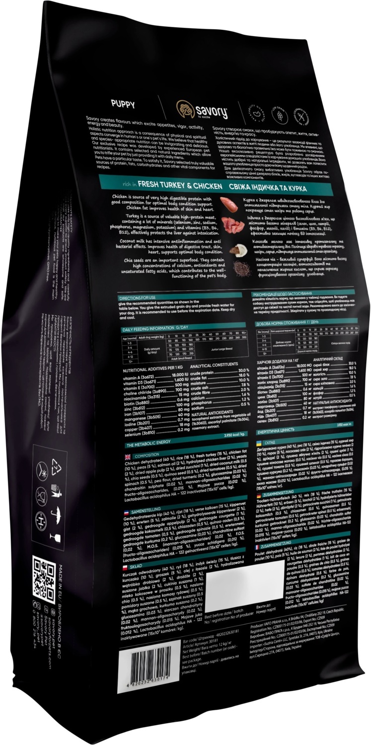 Ексклюзивна рецептура корму була розроблена досвідченими європейськими фахівцями з харчування хатніх улюбленців. Використовуючи холістичний підхід, вдалося створити біологічно відповідний, здоровий раціон для собак, який є таким корисним і смачним, що лапки оближеш. Поєднання добірних натуральних інгредієнтів дає змогу піклуватися про здоров'я чотириногого, а вишуканий смак — дарувати йому насолоду від щоденного споживання корму Savory. Сухий корм для цуценят Savory містить 55% якісного м'яса індички та курки, суперфуди, яблука, цукіні, шпинат. Ці компоненти створені природою для здорового росту і гармонійного розвитку малюка.
