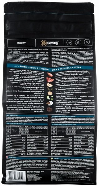 Ексклюзивна рецептура корму була розроблена досвідченими європейськими фахівцями з харчування хатніх улюбленців. Використовуючи холістичний підхід, вдалося створити біологічно відповідний, здоровий раціон для собак, який є таким корисним і смачним, що лапки оближеш. Поєднання добірних натуральних інгредієнтів дає змогу піклуватися про здоров'я чотириногого, а вишуканий смак — дарувати йому насолоду від щоденного споживання корму Savory. Сухий корм для цуценят Savory містить 55% якісного м'яса індички та курки, суперфуди, яблука, цукіні, шпинат. Ці компоненти створені природою для здорового росту і гармонійного розвитку малюка.