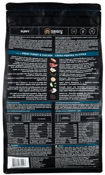 Ексклюзивна рецептура корму була розроблена досвідченими європейськими фахівцями з харчування хатніх улюбленців. Використовуючи холістичний підхід, вдалося створити біологічно відповідний, здоровий раціон для собак, який є таким корисним і смачним, що лапки оближеш. Поєднання добірних натуральних інгредієнтів дає змогу піклуватися про здоров'я чотириногого, а вишуканий смак — дарувати йому насолоду від щоденного споживання корму Savory. Сухий корм для цуценят Savory містить 55% якісного м'яса індички та курки, суперфуди, яблука, цукіні, шпинат. Ці компоненти створені природою для здорового росту і гармонійного розвитку малюка.