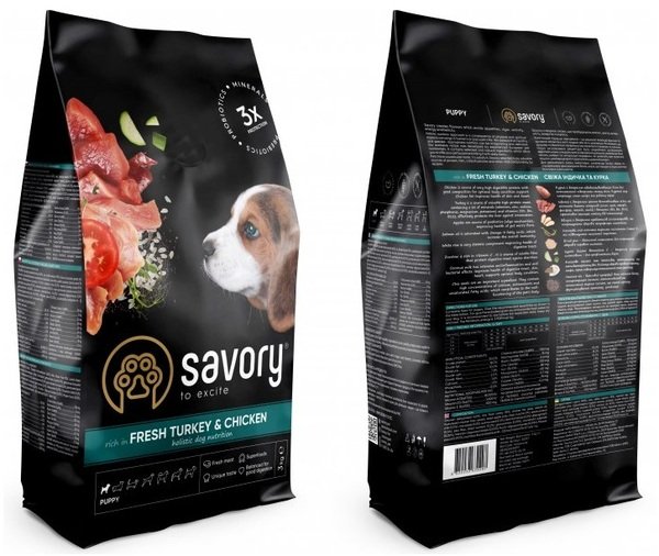 - Сухий корм для цуценят Savory зі свіжим м'ясом індички и куркою 3кг