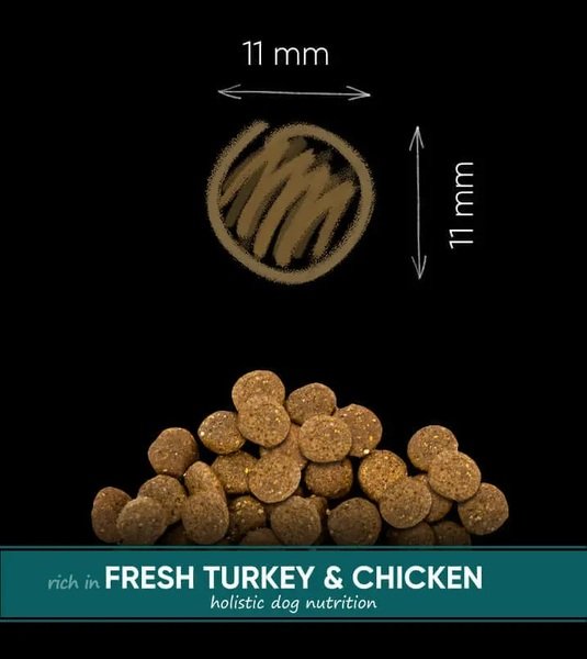 | Склад | Дегідратована курка (40%), рис, свіжа індичка (15%), курячий жир, лососевий жир, гідролізована куряча печінка, дріжджі, сушені яблука, насіння чіа (0.5%), насіння кіноа (0.5%), сушені помідори (0.5%), сушений шпинат (0.5%), Мінерали, куркума сушена (0.2%), глюкозамін (0.03%), хондроїтин сульфат (0.02%), мананолігосахариди (0.02%) фруктоолігосахариди (0.0%). 0.5%), юкка Шидігера (0.012%), лактобактерії ацидофільні НА – 122 інактивовані (15х10 клітин/кг) |