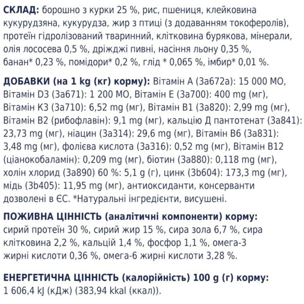 | Аналітичні компоненти | Сирий протеїн 30%, сирий жир 15%, сира зола 6,7%, сира клітковина 2,2%, кальцій 1,4%, фосфор 1,1%, омега-3 жирні кислоти 0,36%, омега-6 жирні кислоти 3,28% |
