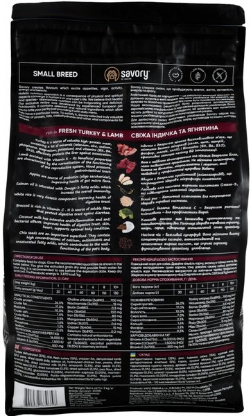 Ексклюзивна рецептура корму була розроблена досвідченими європейськими фахівцями з харчування хатніх улюбленців. Використовуючи холістичний підхід, вдалося створити біологічно відповідний, здоровий раціон для собак, який є таким корисним і смачним, що лапки оближеш. Поєднання добірних натуральних інгредієнтів дає змогу піклуватися про здоров'я чотириногого, а вишуканий смак — дарувати йому насолоду від щоденного споживання корму Savory. Сухий корм для собак малих порід Savory містить 53% якісного м'яса індички та ягняти, суперфуди, яблука, броколі, шпинат. Ці компоненти створені природою для невеликого, але дуже активного песика. Гранули корму розроблені з урахуванням анатомічних особливостей собак малих порід.
