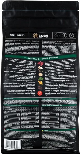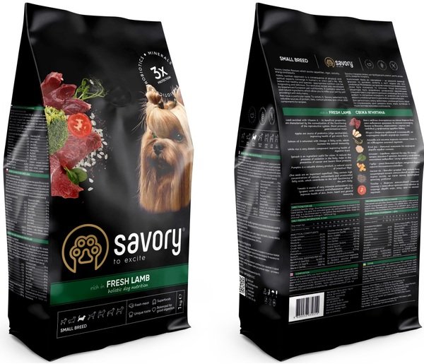 Ексклюзивна рецептура корму була розроблена досвідченими європейськими фахівцями з харчування хатніх тварин. Використовуючи холістичний підхід, вдалося створити біологічно відповідний, здоровий раціон для собак, який є таким корисним і смачним, що лапки оближеш. Поєднання добірних натуральних інгредієнтів дає змогу піклуватися про здоров'я чотириногого, а вишуканий смак — дарувати йому насолоду від щоденного споживання корму Savory. Сухий корм для собак малих порід Savory містить якісне м'ясо ягняти, суперфуди, гарбуз, шпинат і помідори. Ці компоненти створені природою для невеликого, але дуже активного песика. Гранули корму розроблені з урахуванням анатомічних особливостей собак малих порід.