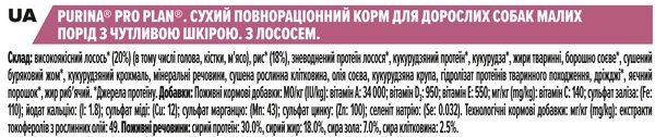 - Сухий корм для собак дрібних порід з чутливою шкірою Purina Pro Plan Adult з лососем і рисом 3 кг