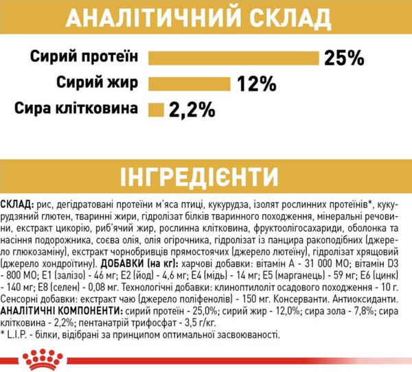 | Склад | Рис, дегідратовані протеїни м'яса птиці, кукурудза, ізолят рослинних протеїнів, кукурудзяний глютен, тваринні жири, гідролізат білків тваринного походження, мінеральні речовини, екстракт цикорію, риб'ячий жир, рослинна клітковина, фруктоолігосахариди, оболонка та насіння гідролізат з панцира ракоподібних (джерело глюкозаміну), екстракт чорнобривців прямостоячих (джерело лютеїну), гідролізат хрящової (джерело хондроїтину) |