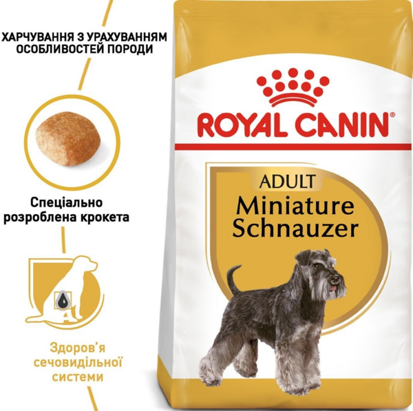 Багато собак цієї породи часто страждають на захворювання сечовипускного каналу й кишківника, тож профілактикою є правильне харчування. Miniature Schnauzer Adult допомагає підтримувати здоров'я сечовидільної системи. Раціон також стимулює собаку до пиття, що сприяє розбавленню сечі.