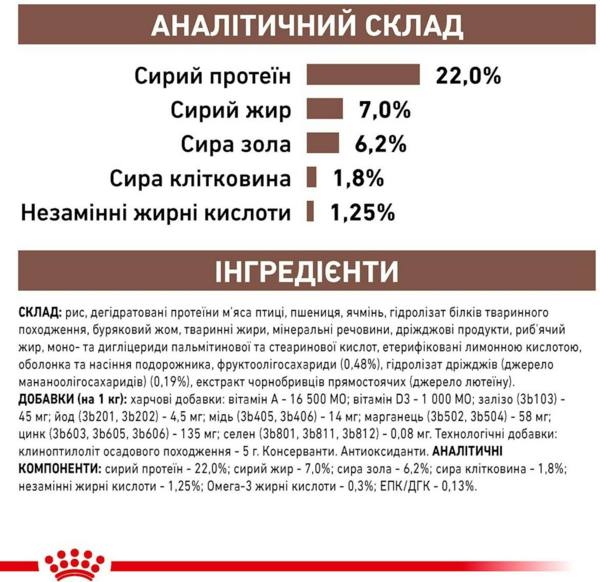 | Склад | Рис, дегідратовані протеїни м'яса птиці, пшениця, ячмінь, гідролізат білків тваринного походження, буряковий жом, тваринні жири, мінеральні речовини, дріжджові продукти, риб'ячий жир, моно- та дигліцериди пальмітинової та стеаринової кислот, етерифіковані лимонною кислотою, фруктоолігосахариди (0,48%), гідролізат дріжджів (джерело маннанолігосахаридів) (0,19%), екстракт чорнобривців прямостоячих (джерело лютеїну) |