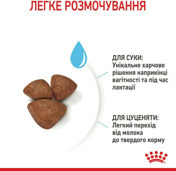 Це унікальне харчове рішення, яке адаптовано до високих енергетичних потреб суки наприкінці вагітності та під час лактації для оптимального росту цуценят.