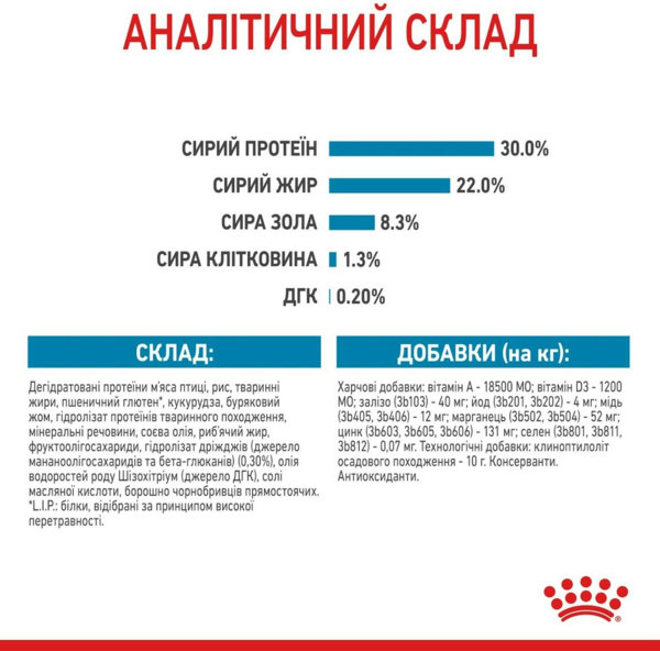 | Склад | Дегідратовані протеїни м'яса птиці, рис, пшеничний глютен, тваринні жири, кукурудза, гідролізат протеїнів тваринного походження, дріжджові продукти, буряковий жом, рослинна клітковина, соєва олія, мінеральні речовини, риб'ячий жир, фруктоолігосахариди канів ) (0,30%), олія водоростей роду шизохітріум (джерело ДГК), борошно чорнобривців прямостоячих |