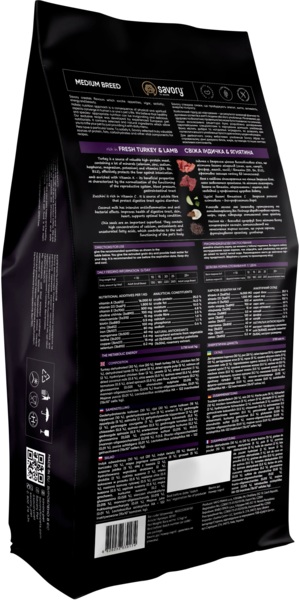 Ексклюзивна рецептура корму була розроблена досвідченими європейськими фахівцями з харчування хатніх улюбленців. Використовуючи холістичний підхід, вдалося створити біологічно відповідний, здоровий раціон для собак, який є таким корисним і смачним, що лапки оближеш. Поєднання добірних натуральних інгредієнтів дає можливість піклуватися про здоров'я чотириногого, а вишуканий смак — дарувати йому насолоду від щоденного споживання корму Savory. Сухий корм для собак середніх порід Savory містить 50% якісного м'яса індички та ягняти, суперфуди, цукіні, шпинат і помідори. Ці компоненти створені природою для завжди бадьорого та життєрадісного песика.