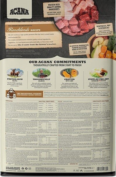 Раціон Acana Ranchlands - багатий якісними м'ясними інгредієнтами (70%) , такими як м'ясо бичків, вирощених на ранчо, свинина, м'ясо ягняти, озерна риба та м'ясо бізона та на 30% збалансований фруктами, овочами, та травами. Всі ці інгредієнти доставляються до нас на кухні щоденно.